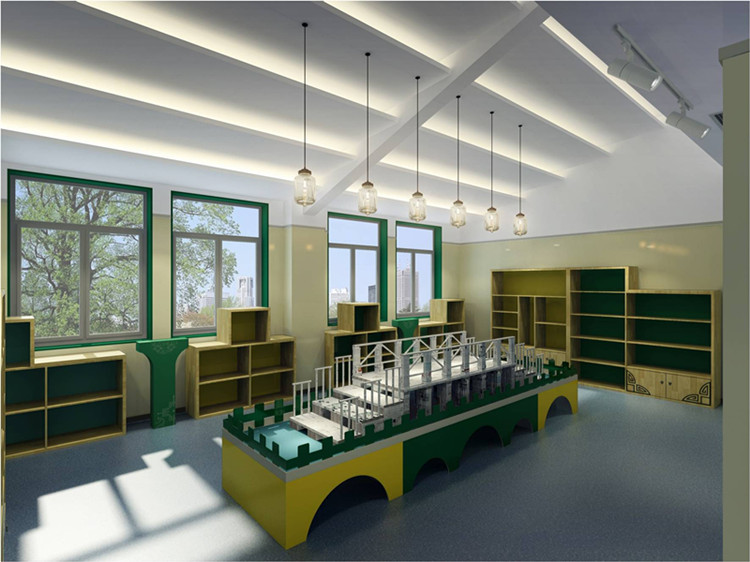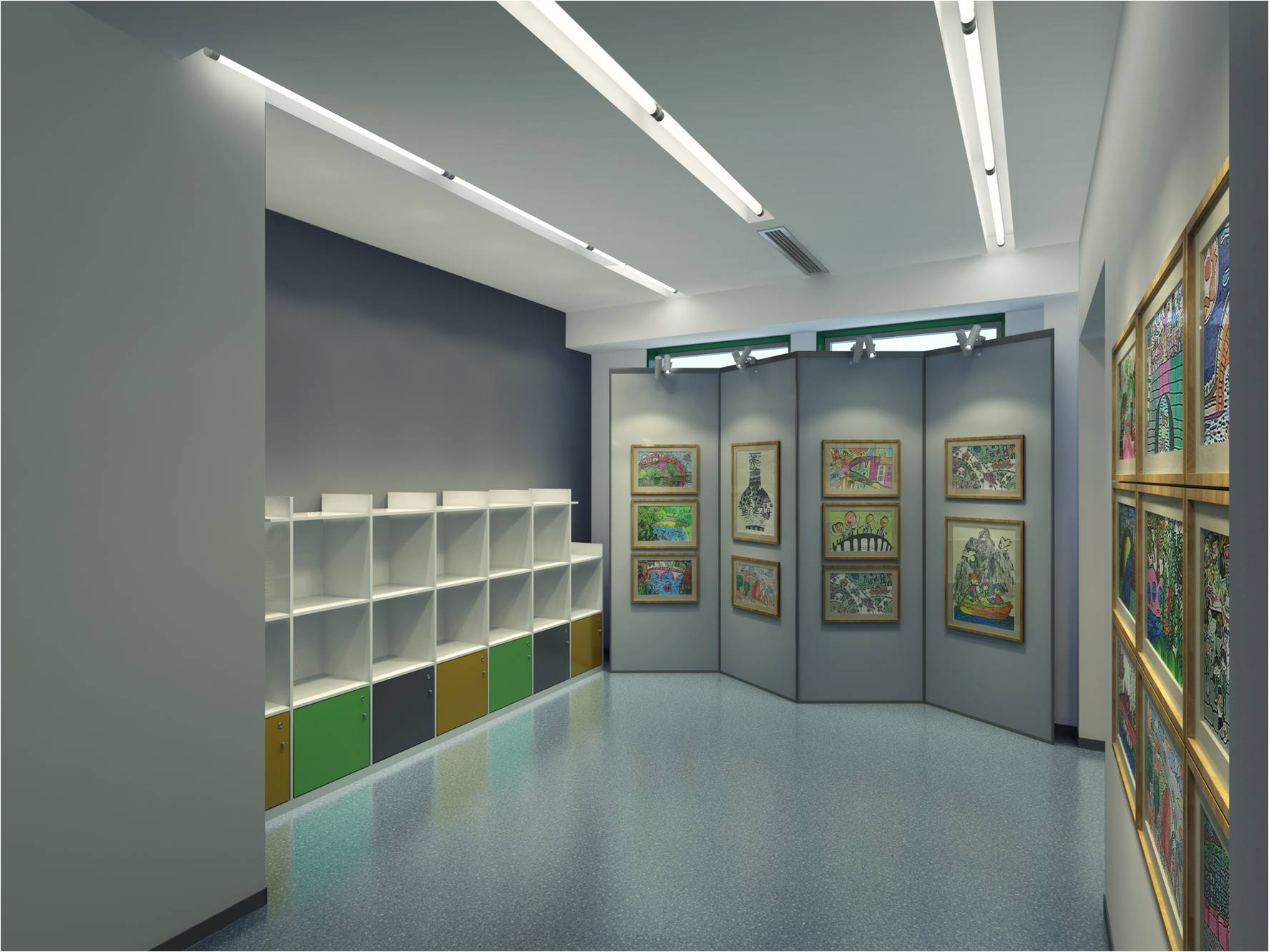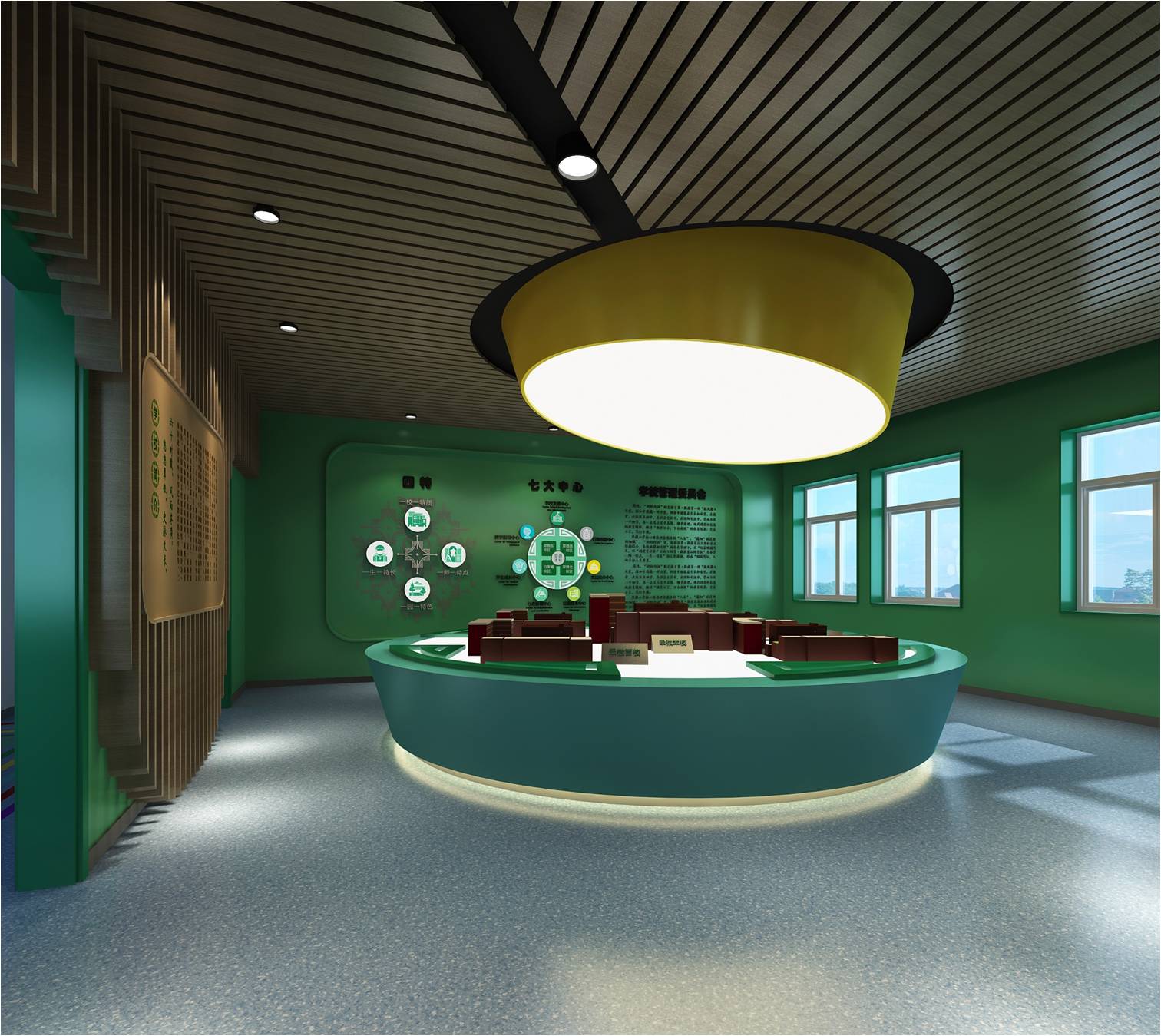 入口結合學校輔助圖形綠色墻面與翠微賦的結合及辦學特色的墻面設計直接將參觀者置于濃濃的文化氛圍中展示了教育的品牌特色。地面不同顏色的色帶將空間功能分布簡單明了的說明給參觀人員。