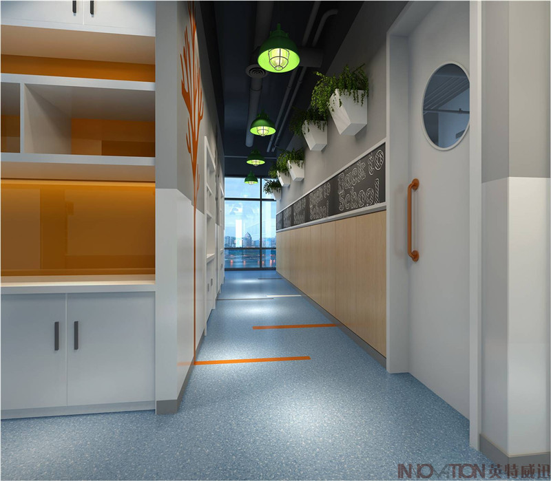 教室設計以藍色背景墻面為基礎,和室內課桌的藍色相呼應,給人一種藍色海洋的清爽感覺。墻面圖案樣式多樣,顏色豐富,突出圖案的多樣性和多變性。