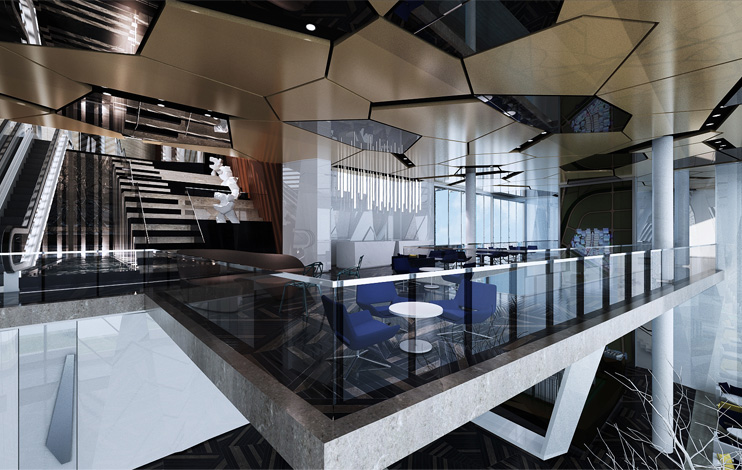 在每個空間設(shè)計(jì)上都體現(xiàn)了“運(yùn)動,健康,文明,和諧,尊崇”的主題。 首先在滿足一層銷售大廳的功能上,中間部位設(shè)置了沙盤展示區(qū)、洽談區(qū),二者相互共享又不相互干擾。沙盤展示設(shè)在中央最顯眼的位置,在沙盤展示區(qū),戶型展示的設(shè)置都圍繞著“展示”這一主題,與沙盤展示區(qū)相結(jié)合,既協(xié)調(diào)又統(tǒng)一。 二樓主樓梯入口處設(shè)置了接待臺,把客人引向各個辦公區(qū)域。