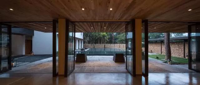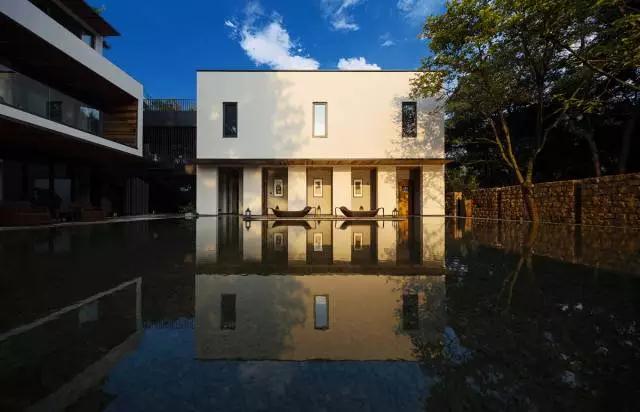 為了強化“禪院”的體驗,“山”的意象也在體驗中被一再提示,不僅進入酒店前需要真實的爬山,一條“游山”的路徑也被設計進了酒店內部:入口及院落被分解在多個標高,爬升行為被有意識地與場所光線的曖昧差別聯系起來。光線被挑檐、水面、柱廊、格柵、天窗等要素仔細控制后,由下至上形成由暗『晦澀』及明『現代』的氛圍轉換,最終在只能看見天與樹冠的屋頂露臺達到明的極致,建筑『人工』從視線中消失。