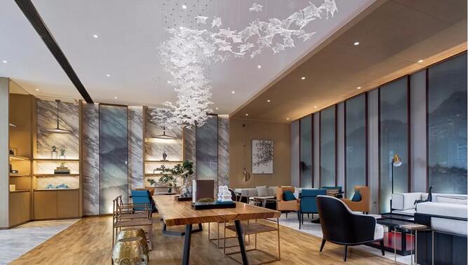 “夫畫道之中,水墨最為上。肇自然之性,成造化之功。”雕塑“墨舞”以濾盡色彩剔透琉璃為墨,飽蘸筆觸,起承轉合,縱橫貫穿于洽談區,成了空間最純粹的風景。