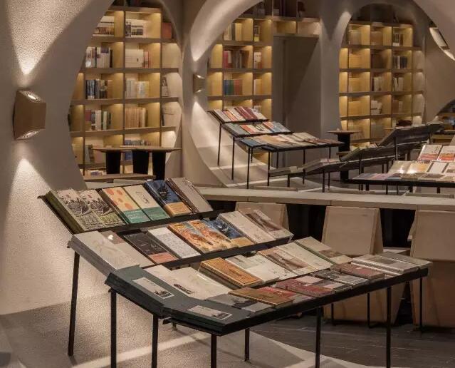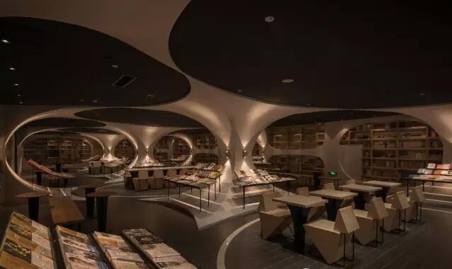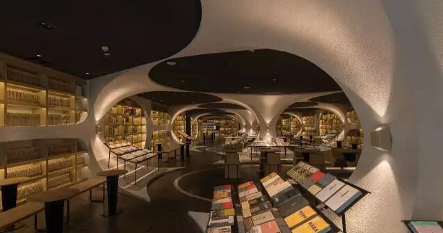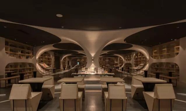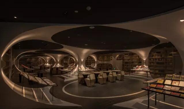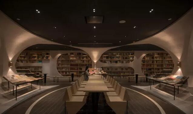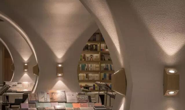走入揚州鐘書閣的正門則是書店的前廳通廊,設計師利用揚州本地拱橋的概念,巧妙地延續了鐘書閣書天書地的視覺符號。在地面與天空中的河流鏗鏘前行中,引領著讀者沉入到浩瀚的知識海洋。兩廂的書架用優美的弧線結構拉伸成天際線的形狀,宛如溪流之上的橋梁,搭建著人與書籍之間的那座心靈橋梁。進而前行至右側則是更加廣闊的書籍之地,拱橋及河流的關系給了設計師無窮的靈感,于是得到此處的上下鏡像的空間關系。設計師還利用各種拱形來連接各個區域,每一位讀者進入這個空間,就能充分感受到這空間帶來的震撼。鏡像、拱形加上柔和的燈光,這一切所帶來的迷離感,會讓讀者不由自主地想起橋下的波光粼粼,悄然靜思中達到心情的平和,并享受讀書的快樂。由各種波起伏連接而成的空間,保留了足夠的尺度,以便留給給讀書分享會的讀者分享的場地。