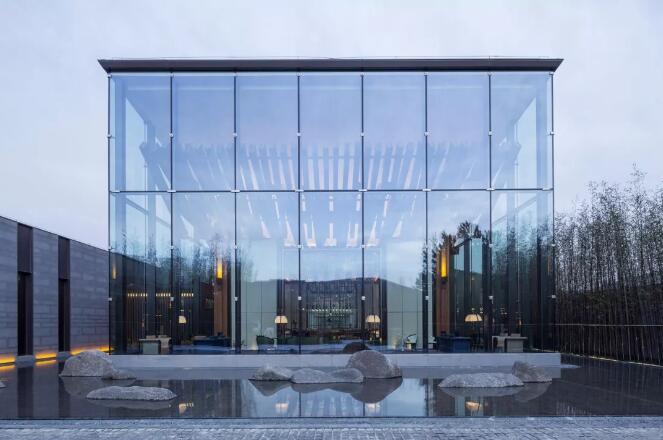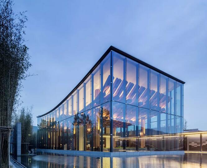 在建筑功能布置上,我們將入口門(mén)廳、放映室、獨(dú)立洽談及后勤等所有需要小尺度空間的功能壓縮到主體建筑東側(cè)的附樓中,從而在主體建筑內(nèi)部形成單一的大尺度展示空間。這樣的平面功能分布,不僅使主體建筑獲得最大的平面自由度,以適應(yīng)前期銷(xiāo)售展示和未來(lái)業(yè)主社區(qū)中心的多功能要求;而且通過(guò)全立面玻璃幕墻的設(shè)置,使得主體建筑的體積感被消解,內(nèi)部活動(dòng)得以最大限度的向城市展現(xiàn),建筑的公共屬性得到強(qiáng)化。