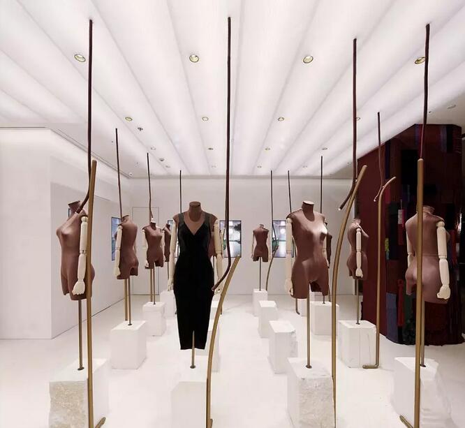 整個空間演變為一個充滿原始氣息的營地,北京裝賣店設計從入口出的手工編織物,到其后粗糲的不規則石墩,金屬的支架如同榕樹枝椏般的枝蔓,與從頂上懸掛的用暗紅麂皮絨包裹的“長辮子“燈具用吸鐵石固定相互支撐,可隨意扭動改變形態。北京專賣店設計吊頂采用16米長陽光板拼裝,陽光板透出上層的環境光,近似彌漫的朦朧天光,營造出部落群居場所的氣息。