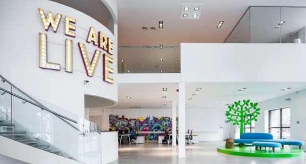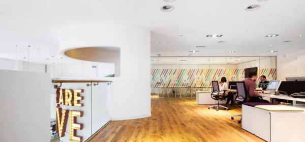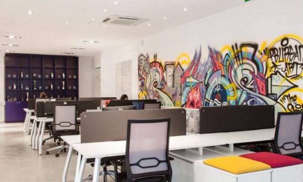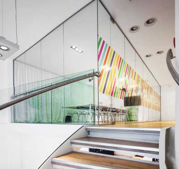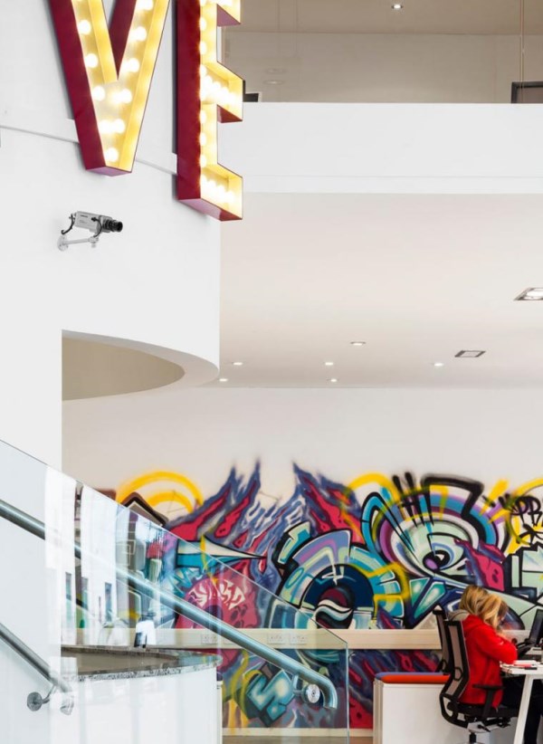 該辦公空間展示出了無限的創造力,從接待處旁邊看,懸掛在彎曲的臺階墻上的“我們都在線”的標語到使辦公室變得活躍的涂鴉墻,每個元素都是精心挑選,可以增強品牌的意識,提升整體的創造力水平。