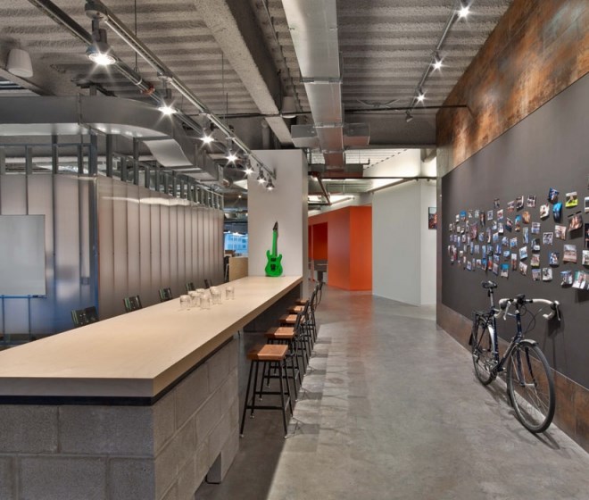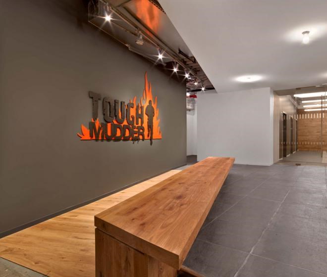 每個元素看起來都十分隨意,不過卻專業(yè)并且十分友好。從模仿考頓鋼的墻面到重新利用的木頭、印著Tough Mudder標志和簽名的水泥煤渣磚會議桌。該設(shè)計提供了一個現(xiàn)代美感與工業(yè)化魅力結(jié)合的空間。