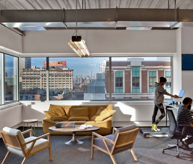 總部辦公室由開放式加上靈活的辦公空間群組成,十分適應(yīng)日益壯大的公司隊伍。位于紐約布魯克林,由接待區(qū)、咖啡室、工作區(qū)、會議區(qū)和互動區(qū)形成的空間歡迎員工的到來。