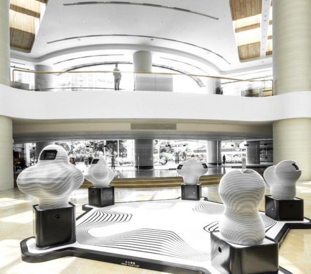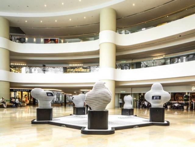 “Now and Then”位于第一層的中心,由五個不同的雕塑組成,每個坐立在盆里,就好像植物一樣,代表了生命和成長。用五角形布置,并且用厚薄的白色線條連接,球根形狀代表著太古廣場的歷史和改變。