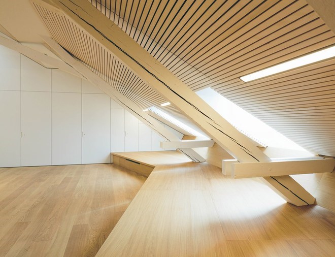 幼兒園的核心是其交通空間,寬敞的樓梯被一個畫廊環繞,雨傘狀的錐形天窗提供了人工和自然光。