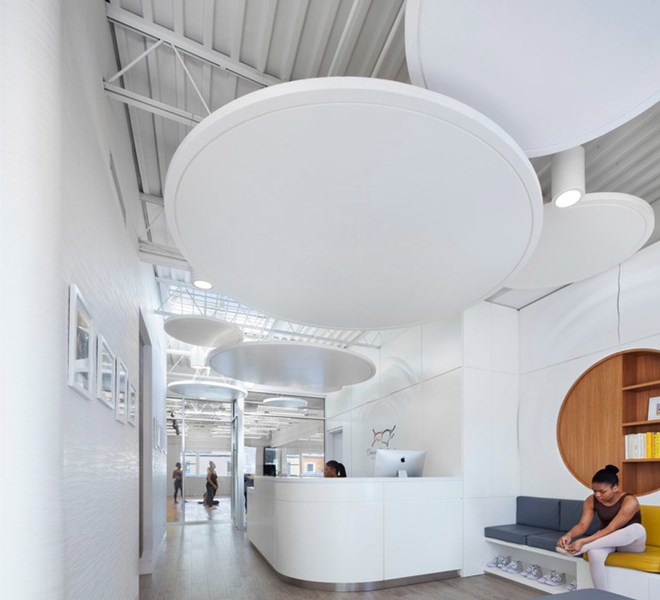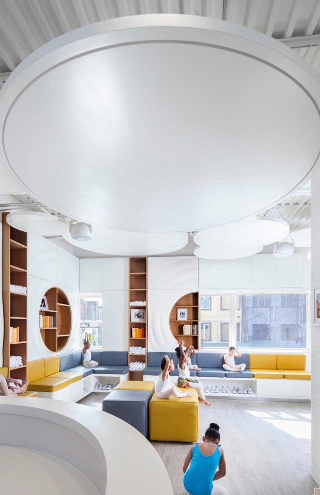 圓形的波紋圖案組成了一個色彩豐富溫馨的圖書室,設有舒適的座椅和社交空間,人們可以安靜地閱讀書籍,做伸展訓練,或是和朋友加深交流。舞蹈教室設有彈簧地板和明亮的天窗,為舞者創造了絕佳的環境。兩間教室之間采用可變隔墻,在演出時可以將隔斷完全打開,形成一個帶遮光簾的巨大舞臺。