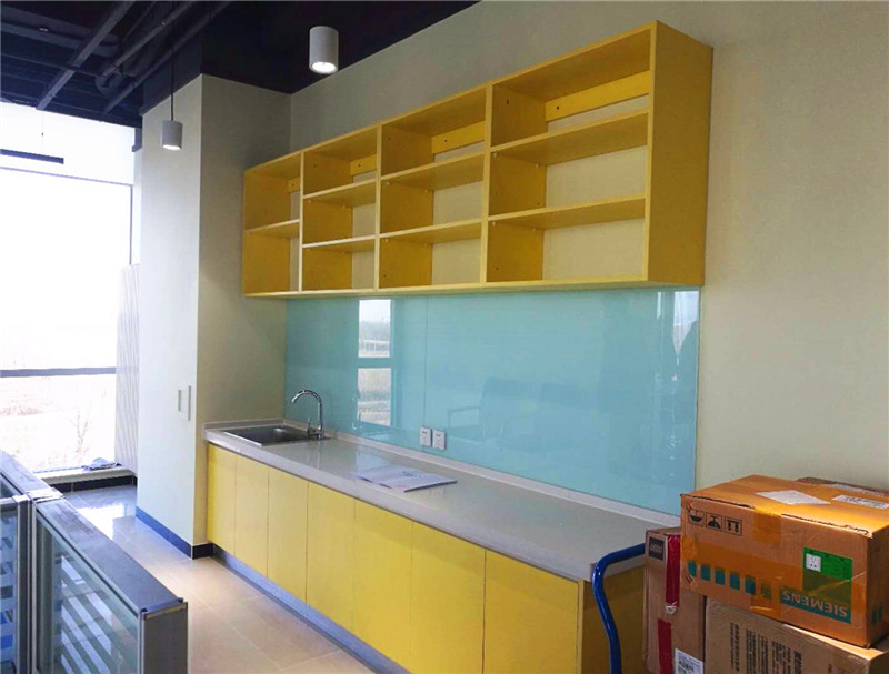 施工材料:氟碳漆、磁力板(便于磁力扣吸附公司宣傳資料)、烤漆板、現代LED吊燈、釉面防滑地磚。