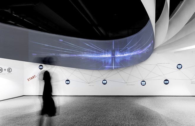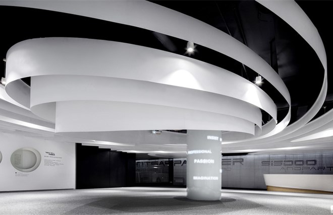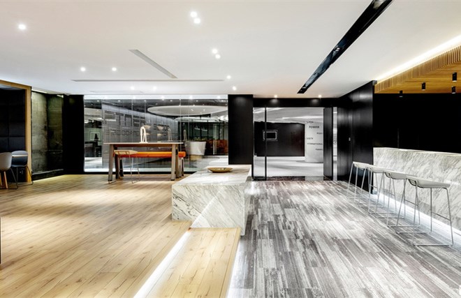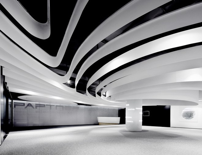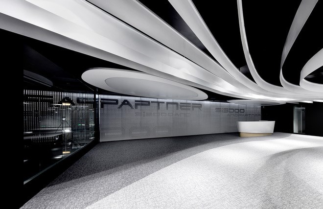 智能化燈光變幻,環繞式視頻投影,加強了空間的未來感與科技感。這里既是前臺區也是展覽空間。減去多余的裝飾,在設計上,峻佳化繁為簡,創造一個純粹神秘的空間,展示著一個品牌的未來想象力。辦公室與展廳的多重變奏,空間既要獨立而連貫又互不干擾,由超前未來區到專業辦公功能展示區,這是設計的一次變奏。