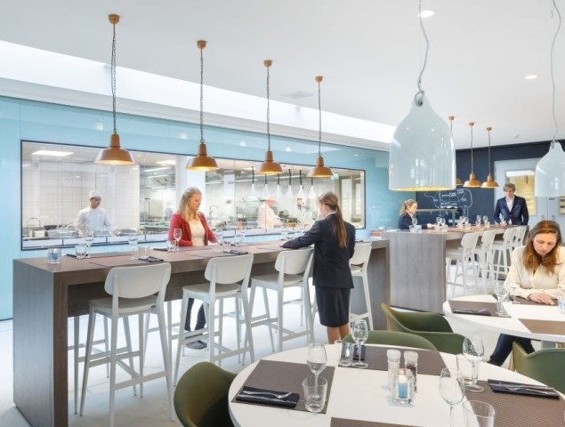 Fokkema & Partners設計的這個校園,為學生們提供了一個設施齊全光線明亮的學習環境,讓他們可以在充滿活力的地方盡情的學習知識鍛煉本領。在中央大廳一層咖啡館的周圍,有一些就餐用的小包廂。這些包廂都具有不同的風格和獨特之處,共同之處是無論是從哪個包廂里,都能看到食物準備室里的一切活動。入口處的遮陽篷,更是讓那個大大的咖啡館顯得更有特點。