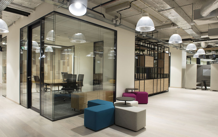 開放空間和輔助空間(文印室、茶水區、付費電話會議室、電話亭等)圍繞一處大型開放的廚房咖吧而設。黑色方管制作的展示架兼具實用和裝飾性,帶來強烈的工業美學特征。