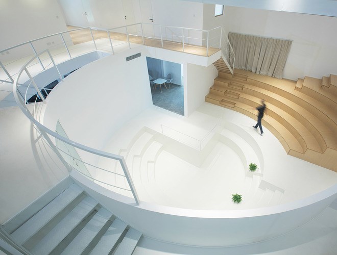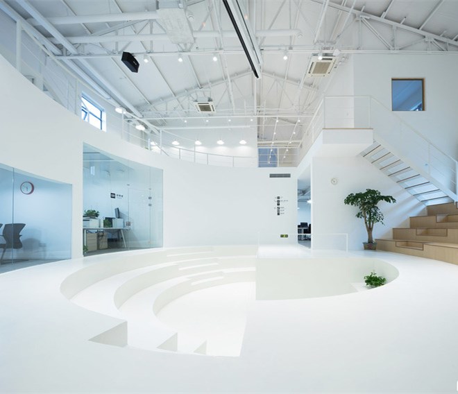 中庭的圓形廣場靈感來源于電影里經典場景土樓的空間特質,保留原始層高的通高空間作為整個設計核心交流場所,從空間設計上塑造一種強烈的集體歸屬感。廣場的四分之三部分作圓形下沉,成為街角式的階梯小劇院,以及提供討論,看電影等一系列公共交往功能。廣場周圍圍繞一圈工作區,包括封閉、半開放辦公室,以及創始人的辦公空間。