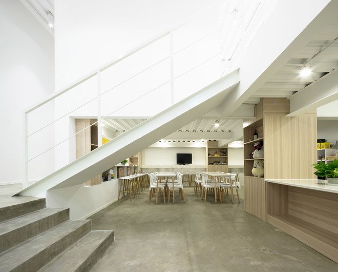 動畫片制作特殊的工作流程,分為前期中期后期三部分。前期制作需要相對自由的氛圍,能帶動創新思考的舒適空間。中期制作作為工作主體,對空間的靈活性和開闊性較有要求。而后期制作則要求嚴格控制光線進入空間內部。彼岸天團隊由創業,發展到現在形成以年輕人為主的一個大家庭氛圍,有自己的廚師,員工晚上有時會加班睡在工作室里。根據這三個不同工作目標的團體的需求,建筑師在這個空曠的方盒子內進行重新規劃,在整個大的空間里面限定出眾多圍和與半圍和的室內空間,以滿足不同的使用需求。