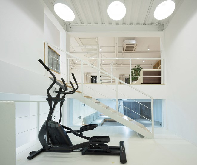 整個設計在保留長方形廠房的基礎上,建筑室內空間輪廓放棄了長方形的限制,建筑室內標高也不再是單一水平,而是功能的分化設置不同區域的標高,通過室內階梯與坡道相互連接。廠房東邊做了兩層標高,一層入口區為形象宣傳,臨近南立面是一個長廊,一半作為電影海報展示,另外一半為微縮景觀。外墻鏤空花磚形式,陽光透過外墻照射到展示長廊。二層為獨立創作空間與兩個創始人工作室。廠房西邊利用層高做了多個標高,從一至四層以及之間的夾層與錯層空間,容納了開敞通透的圖書室,封閉的觀影室,健身房、淋浴室、半地下(負一米)廚房、聚餐和party空間,也有加班可以休息的睡眠空間。