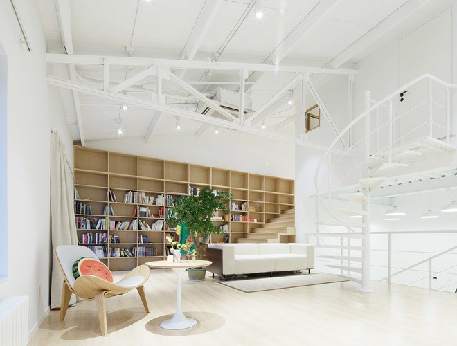 彼岸天總部辦公室位于吉里(北京)國際藝術區,其成名作中國動畫電影《大魚海棠》2017年于第15屆布達佩斯國際動畫電影節斬獲最佳動畫片。吉里(北京)國際藝術區內聚集了各類影視產業企業,大魚海棠的新辦公空間選定在9米層高的一座老廠房內。新空間保留了老廠房的屋架和外立面的圍護結構,在保持老廠房記憶的同時,重新設計了部分辦公空間的外墻,以及全部門窗和基礎,植入新的鋼結構進行功能體塊分割,達到新與舊的共融和碰撞。整個園區是灰蒙蒙的老廠房,而新空間外墻選用白色基調一直延伸到室內,搭配部分木材質感,給予通透和純凈的感受。
