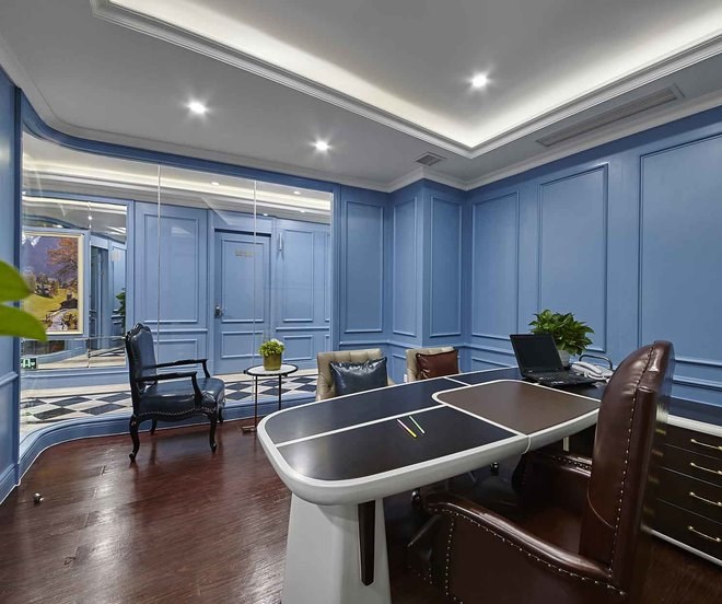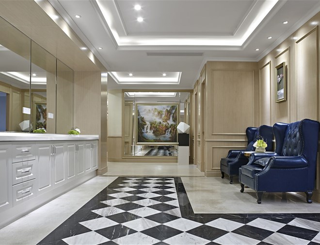 一層強調英倫的雅致及品位,用淺藍色歐式墻面穿插整個空間,強列的空間視角關系,讓客戶流連忘返,記憶深刻,達到商業醫院經營的目的。在本層還很貼心的設立了兒童娛樂區,在兒童娛樂區隨處可見的城堡元素、七彩吊燈、搖搖馬等仿佛讓兒童進到這里就感覺身處游戲城堡之中,大大緩解了就醫前的緊張心情。