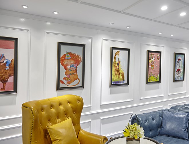 英式風格追求精致手工藝設計,講究作品的精雕細琢,照片墻、版畫、定制的口腔類雕塑等工藝品也是本案室內設計的一大特征,藝術氣息特別濃厚。要把握英國文化元素的精髓,我們要明白一種“紳士”氣質,這用在英式風格里絕不為過。一切都顯得那么內斂、謙虛且不失品質。