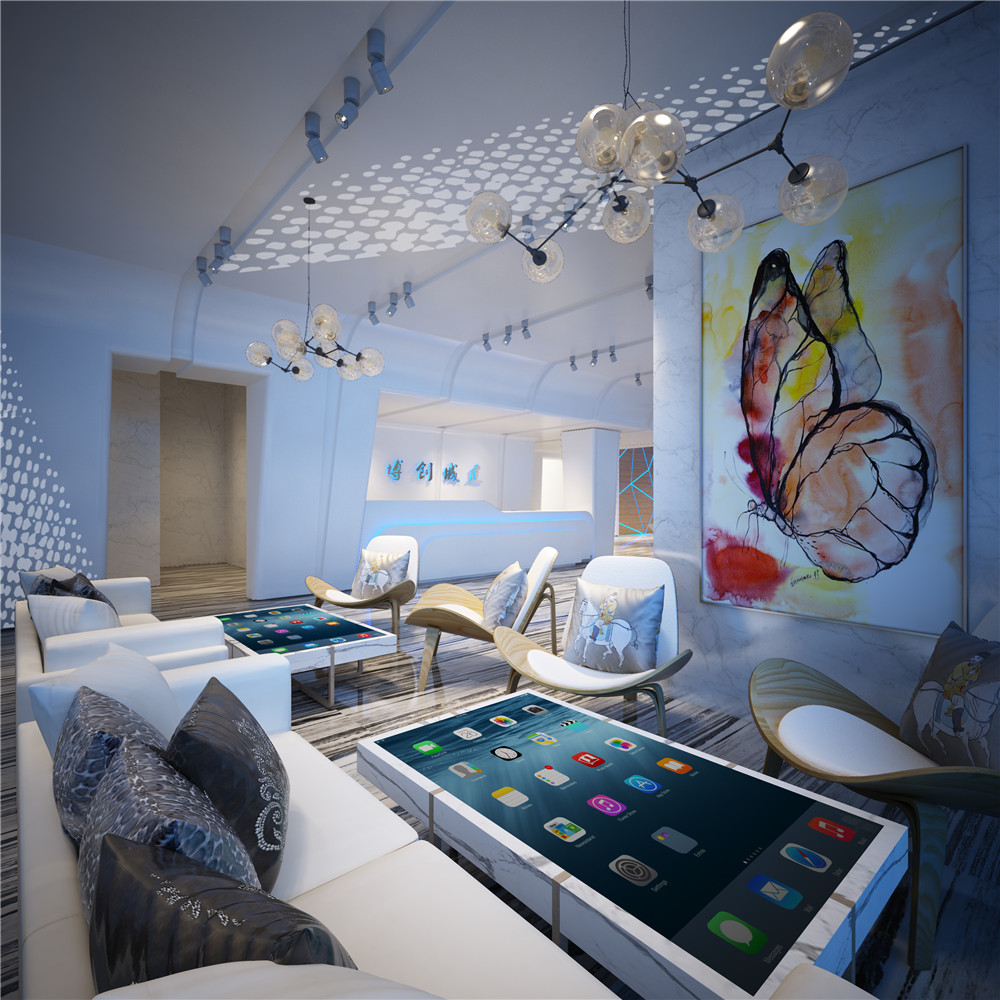 雍容虎歸的洽談接待區展現出一種高貴的氣息,顯得非常別具一格。在整個大廳的中央,擺放著一個橢圓形的樓盤景觀圖,可以非常方便的讓客戶看到樓盤附近的情況,體現出現代設計人性化的一面。
