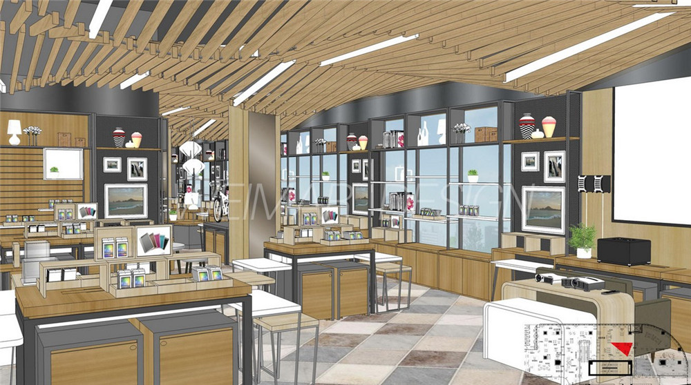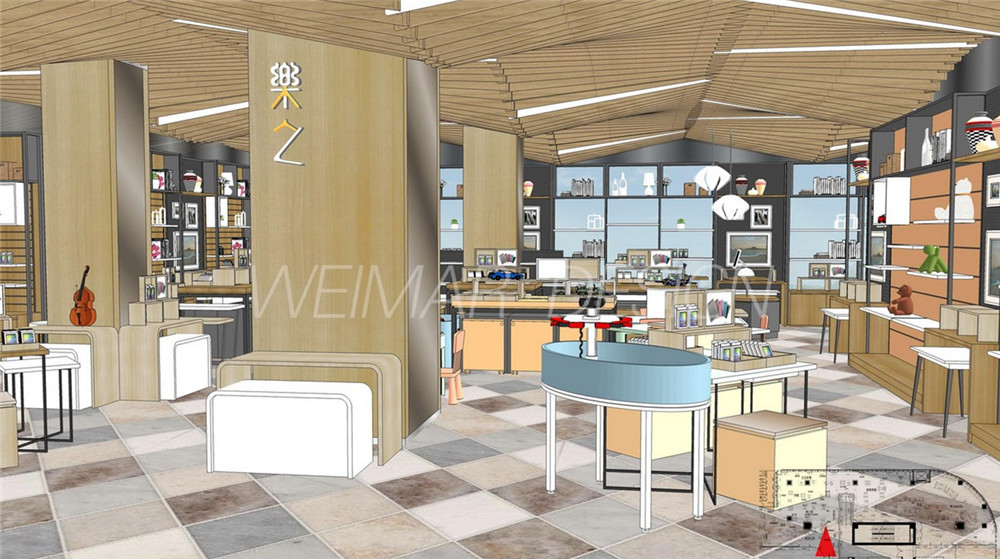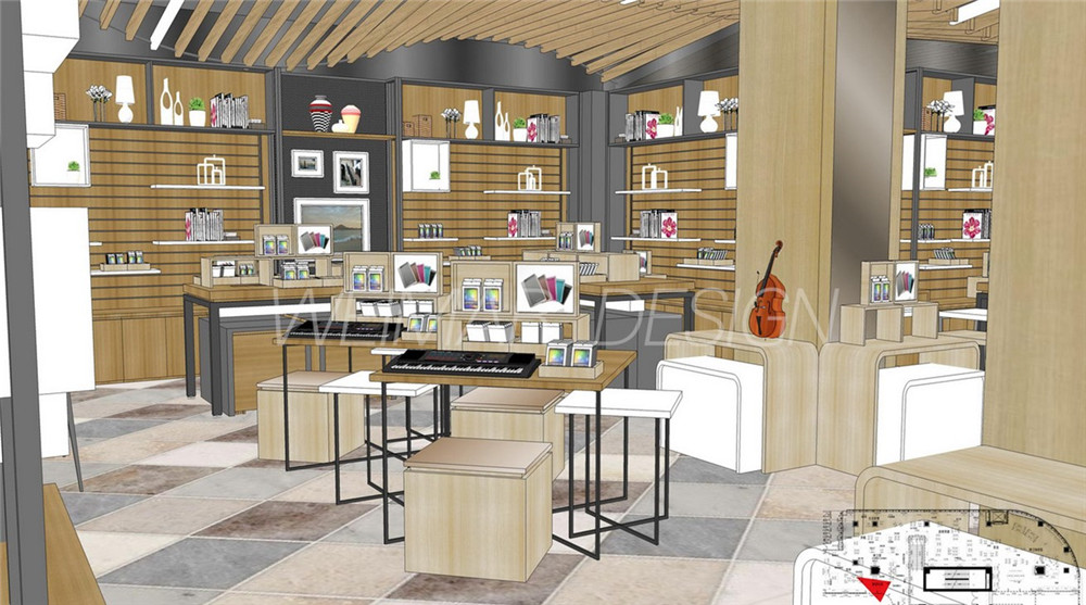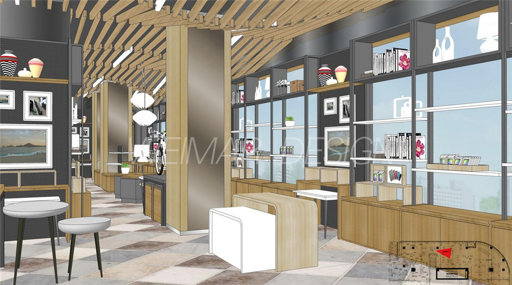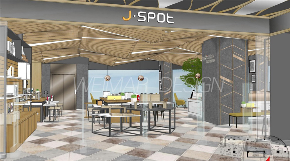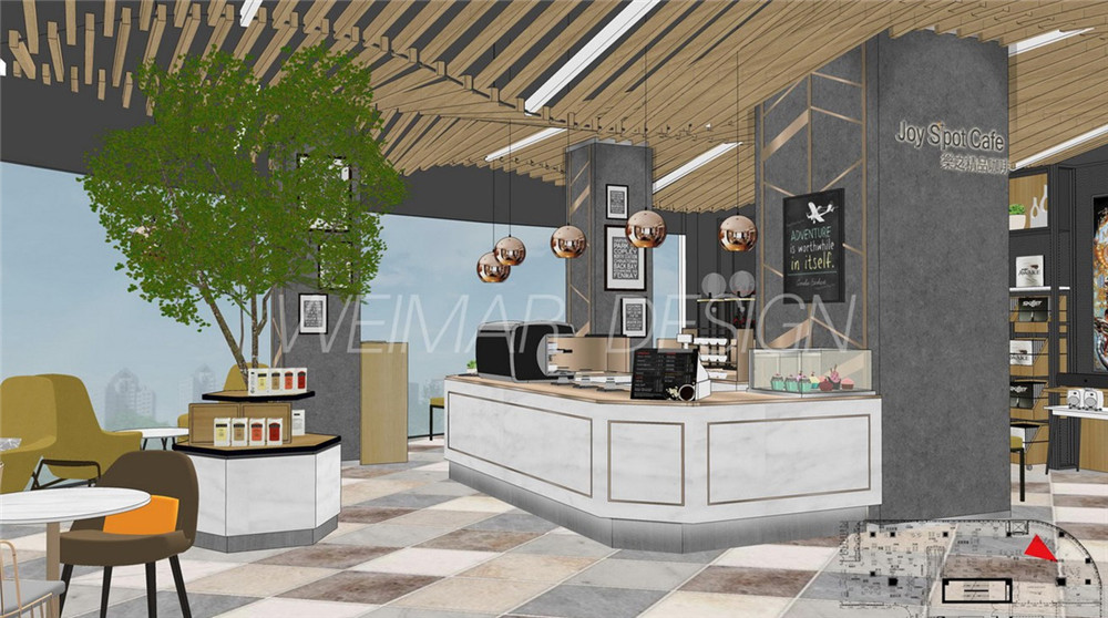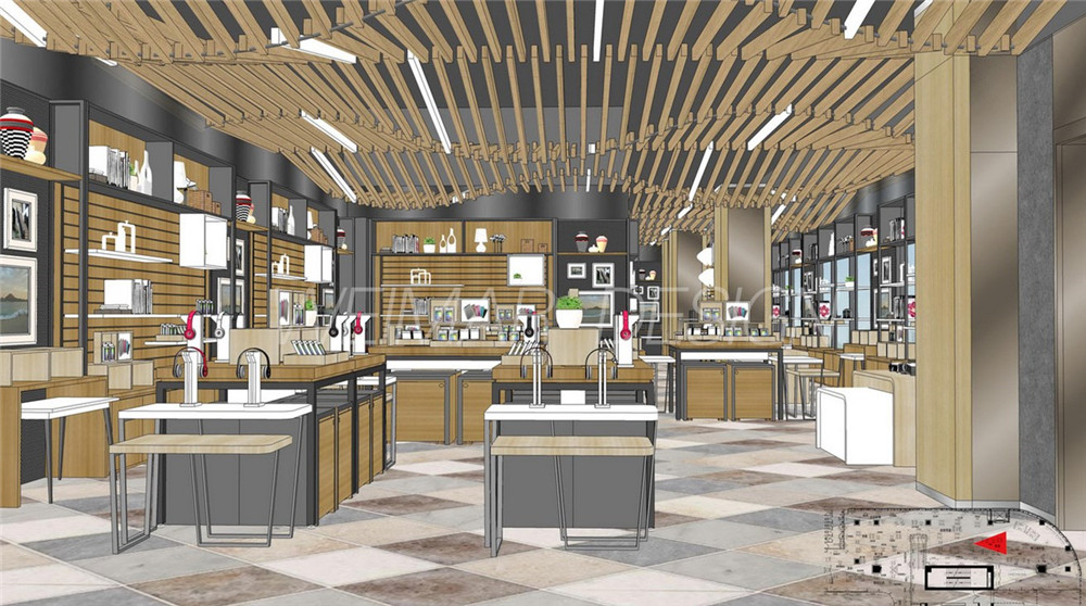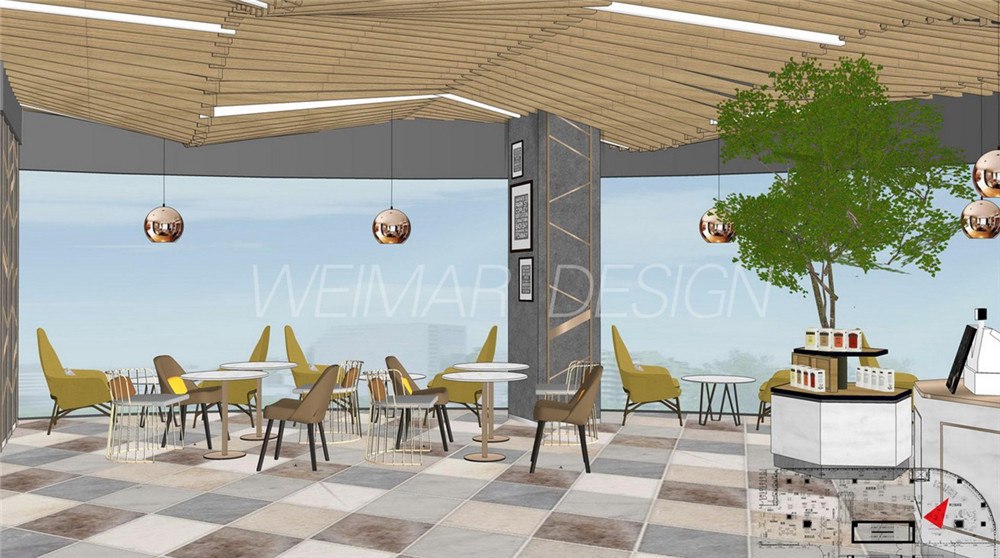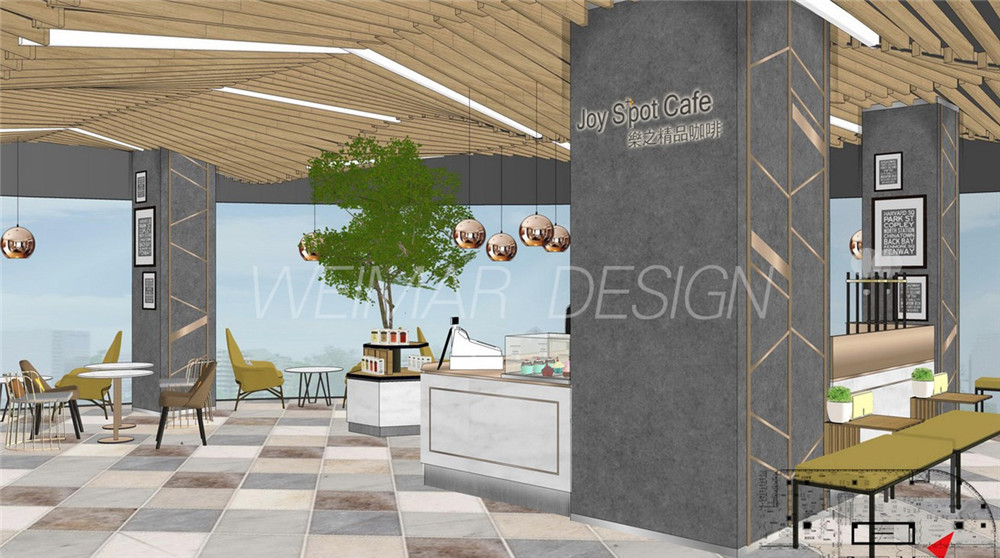 本方案是以音樂的旋律感為設(shè)計(jì)主題,整個(gè)咖啡廳設(shè)計(jì)中運(yùn)用了波浪形的線形來體現(xiàn)旋律感,大堂吊頂用大面積的波浪形木條做造型,蜿蜒起伏,既有旋律感也略帶有一絲動(dòng)感。