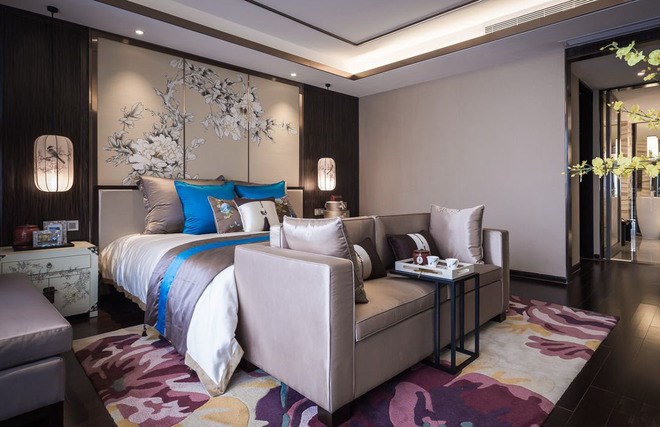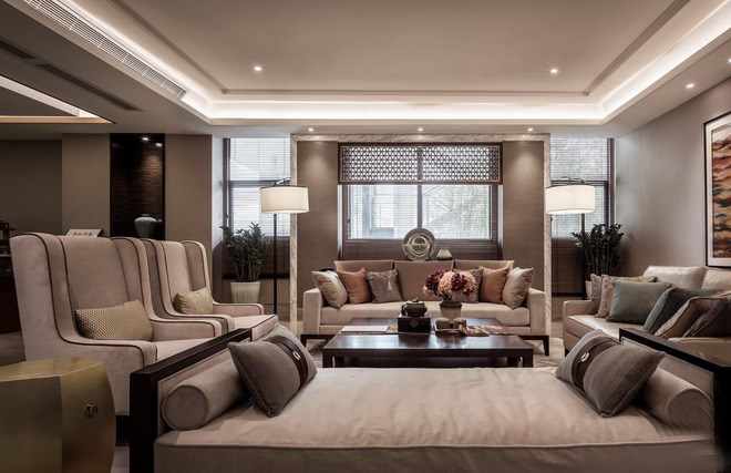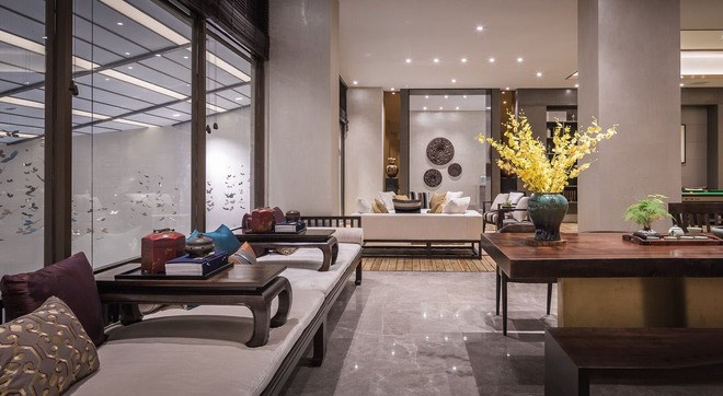 在平面處理上,我們以對景、虛實、疏密、藏露、繁簡等手法串聯(lián)各功能空間,一如山靜水動、山陰水陽、山仁水智的陰陽媾和的復合理念,呈現(xiàn)出一派舒適、休閑又兼具品質的山海生活景象。山是精神,亦是境界。在立面上我們用寫意畫的筆觸,輔以深色勾線、淺色帶面,賦予“山”的硬朗。同時,我們在終飾物料及藝術品中亦融入山水肌理和意向,以“水”之陰柔與其和諧相生。