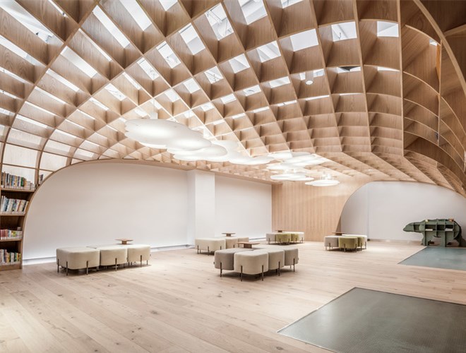 在入口層(上層),曲線的仿木鋁板柔和地升起降落,云片狀的吊燈蜿蜒穿越其中,仿佛庭院綠意被最大程度引入室內后,被提煉形成森林一般自由自在的空間感,社區居民可以在這里卸下面具而放松的交往,這似乎可以看見有如節日的歡快和愉悅。