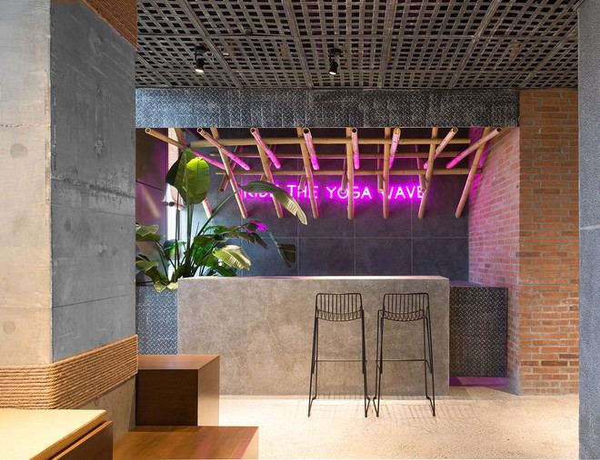 設計主要在于材料的運用上。室內的墻面以及地板都鋪上了鵝卵石、水磨石和水泥,仿佛漫步在城市中的街道,寧靜平和。而這些原生材料和木制,竹子,編織物以及榻榻米這些柔和的材料在不經意間趨向于一種平衡的狀態。