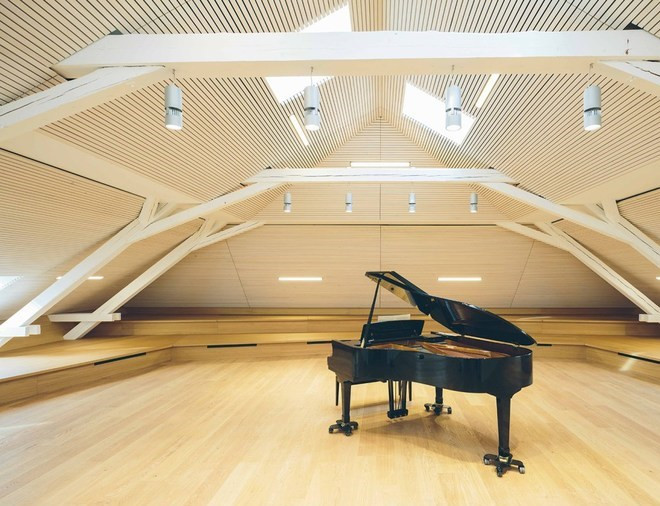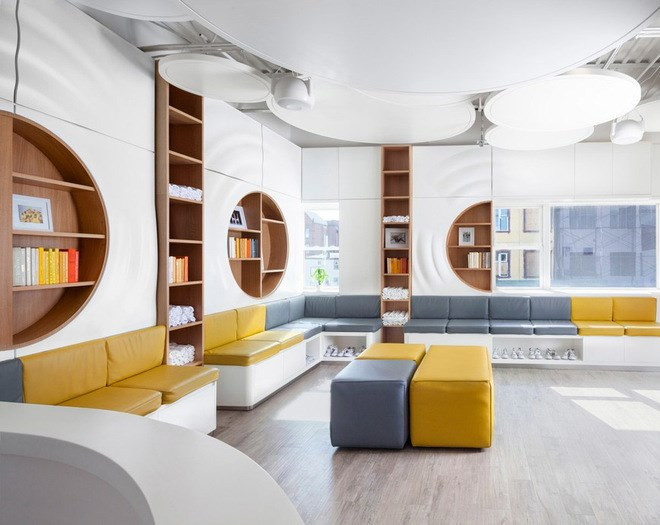 幼兒園的核心是其交通空間,寬敞的樓梯被一個畫廊環繞,雨傘狀的錐形天窗提供了人工和自然光。