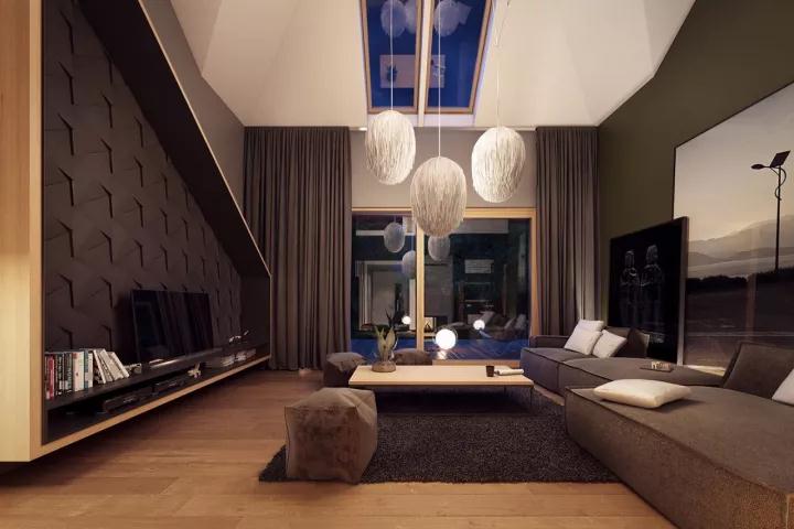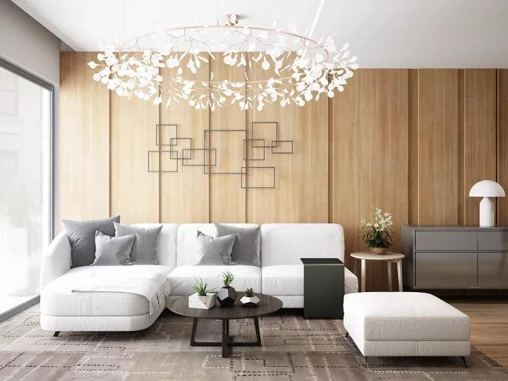 同樹枝結(jié)構(gòu)相類似的還有花瓣型吊燈,設(shè)計獨特美觀,光源如同螢火般匯聚在一起,讓房屋充滿溫馨。
